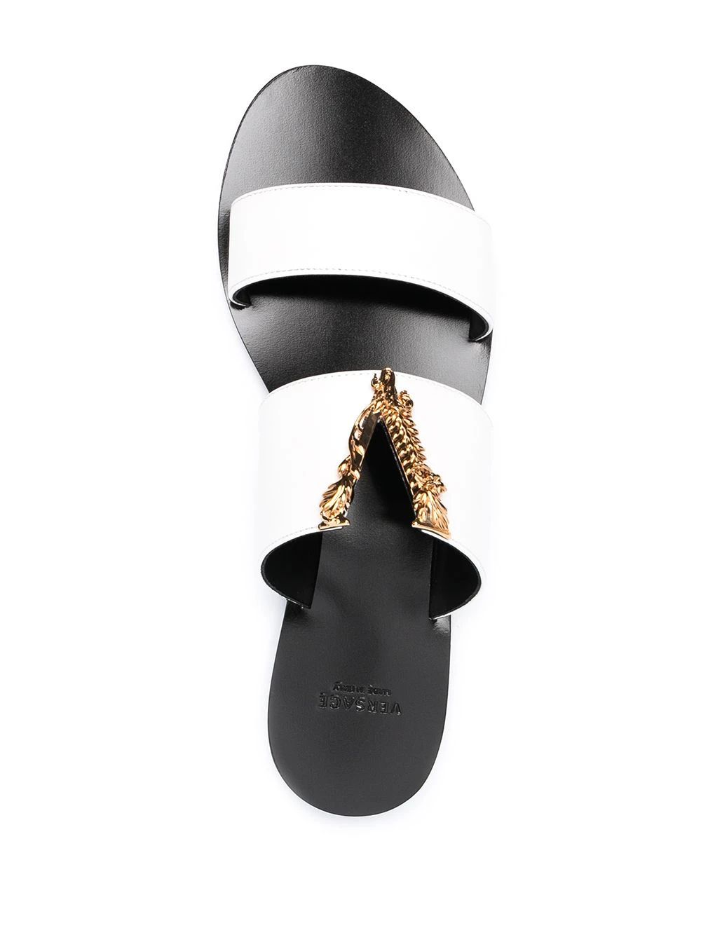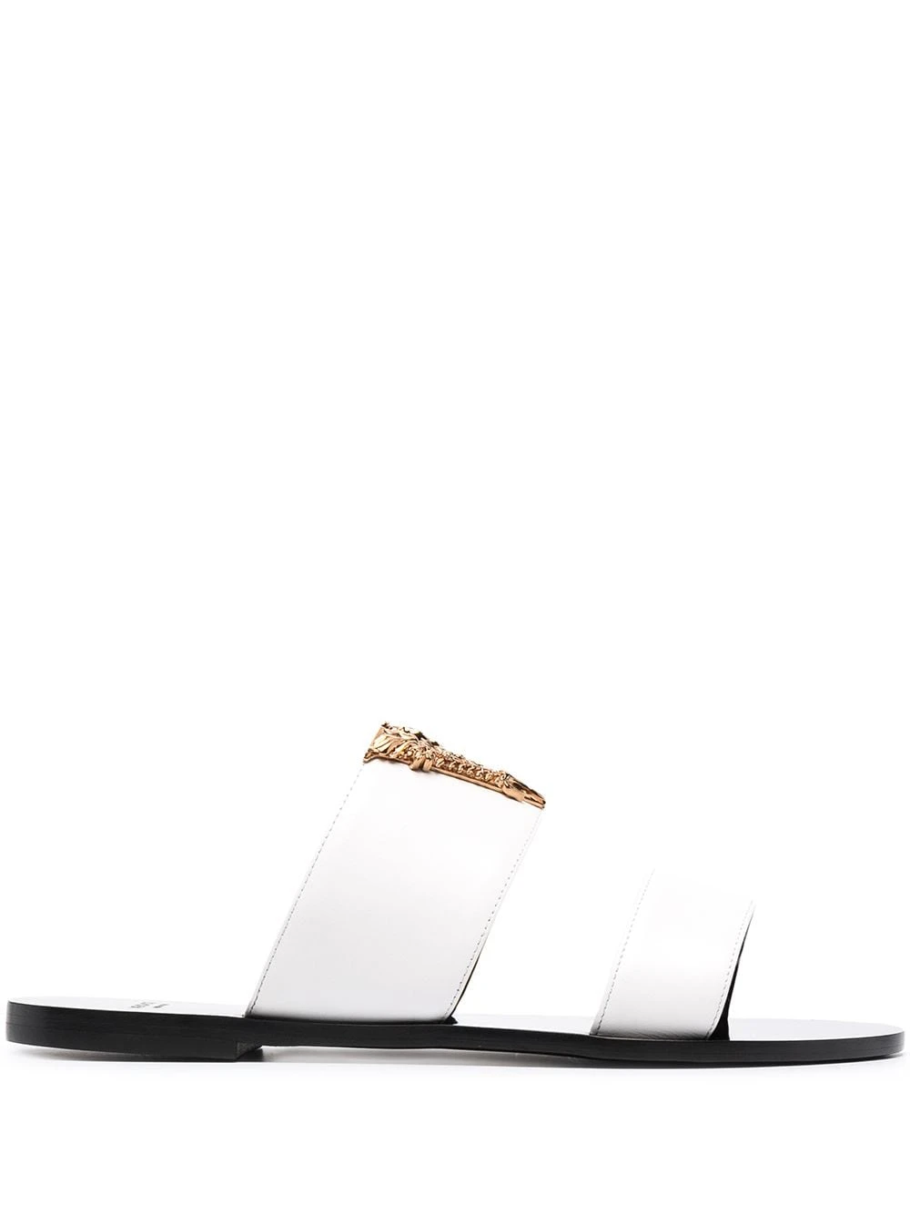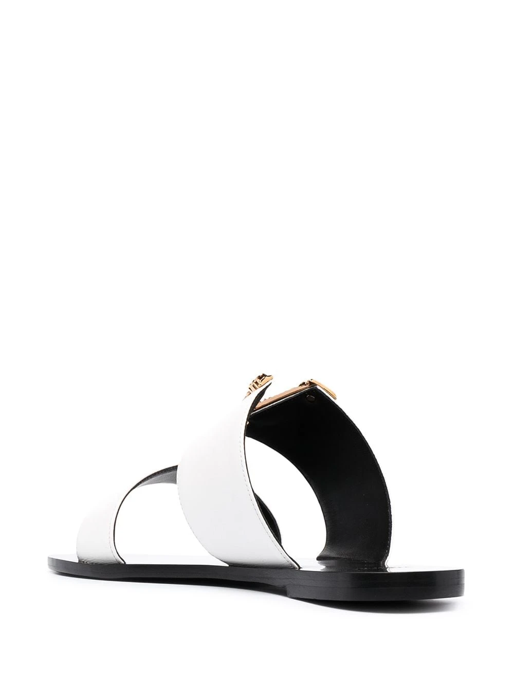 Plaque logo dorée, design à enfiler, bout ouvert, semelle en cuir. Couleur : blanc. Matière : cuir.