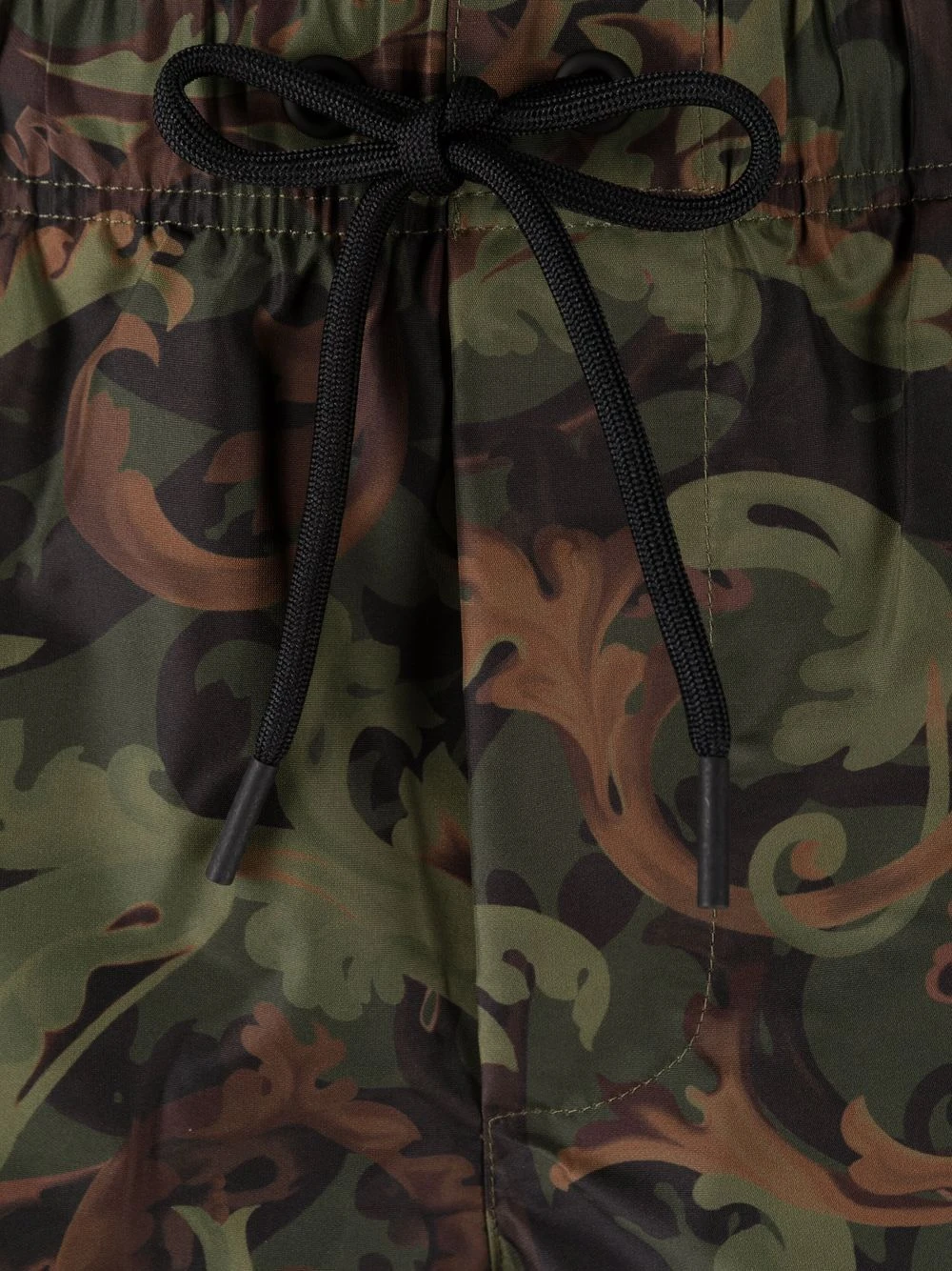 Motif baroque, taille élastique à lien de resserrage, logo imprimé sur le devant, poches latérales fendues.