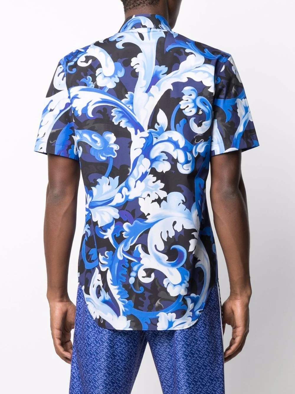 Imprimé Baroccoflage signature, col classique, poche poitrine plaquée, manches courtes, boutonnière sur le devant, ourlet incurvé. Couleur : bleu. Matière : coton.