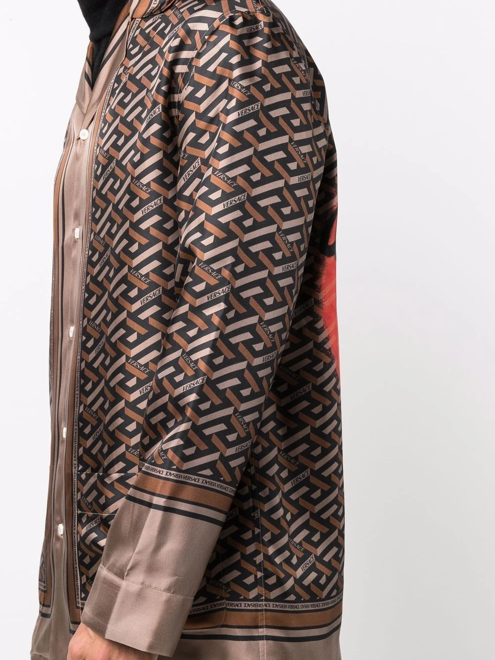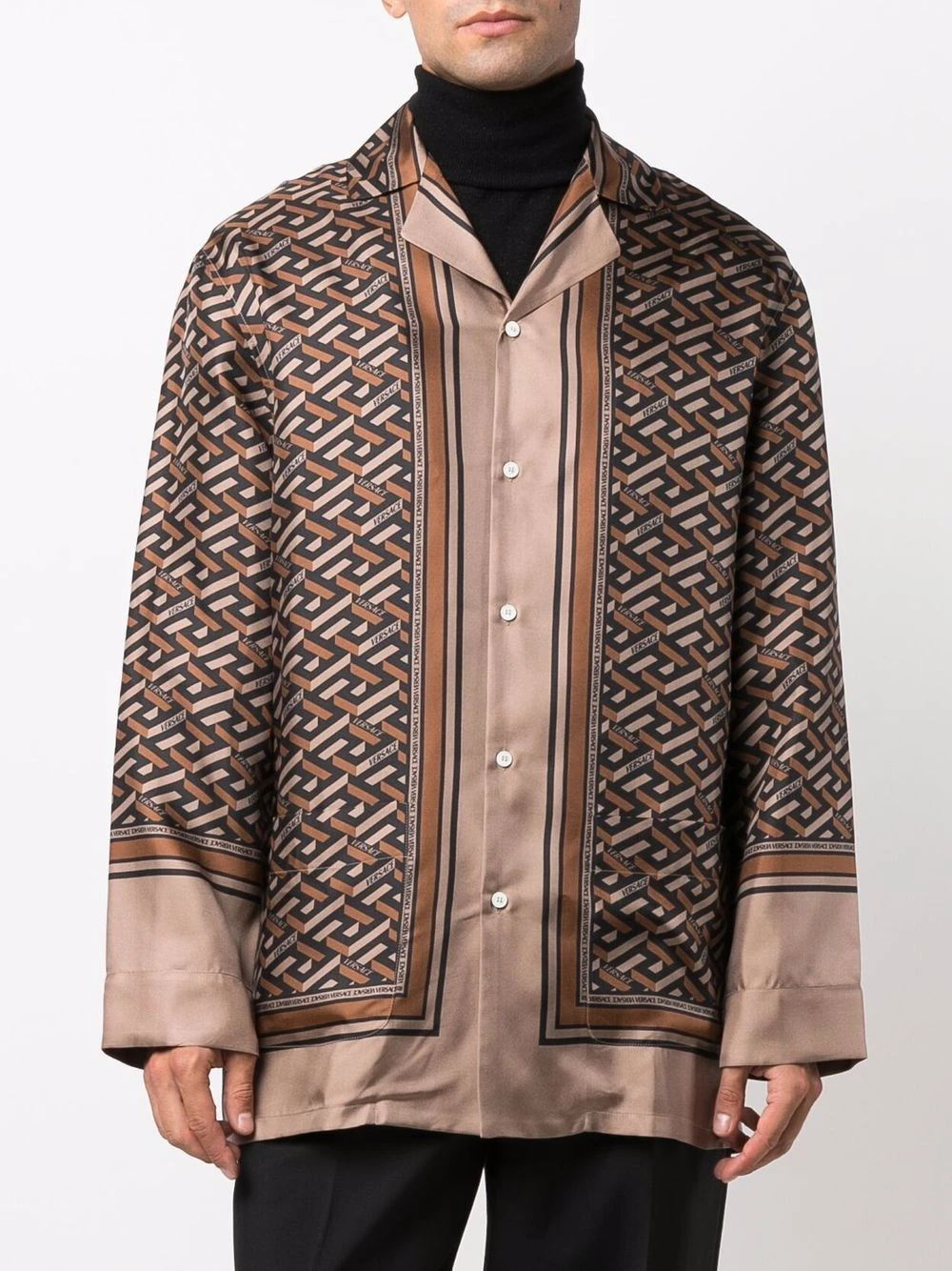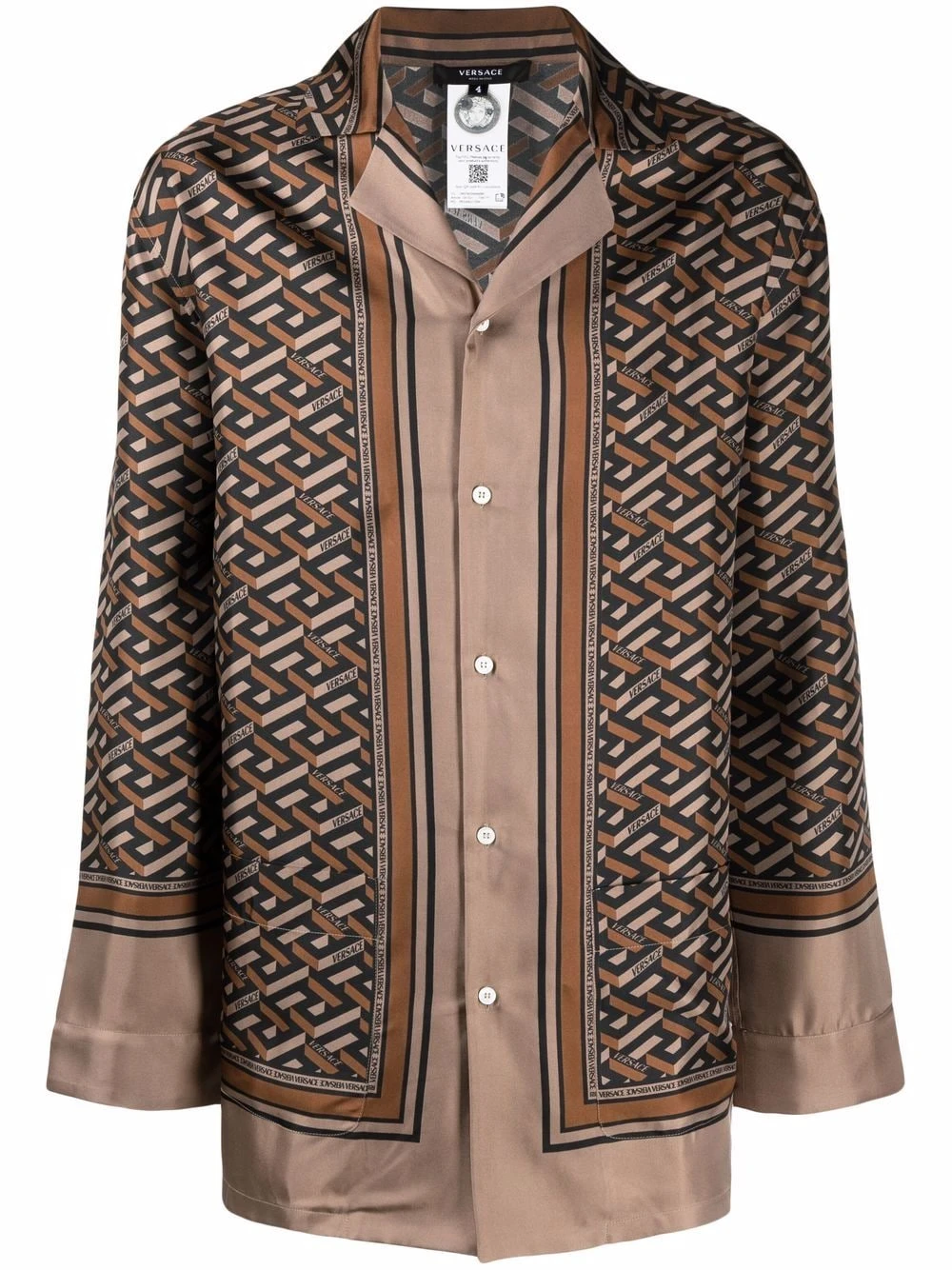 Imprimé La Greca signature, motif Medusa, col cranté, manches longues, boutonnière sur le devant. Matière : soie.