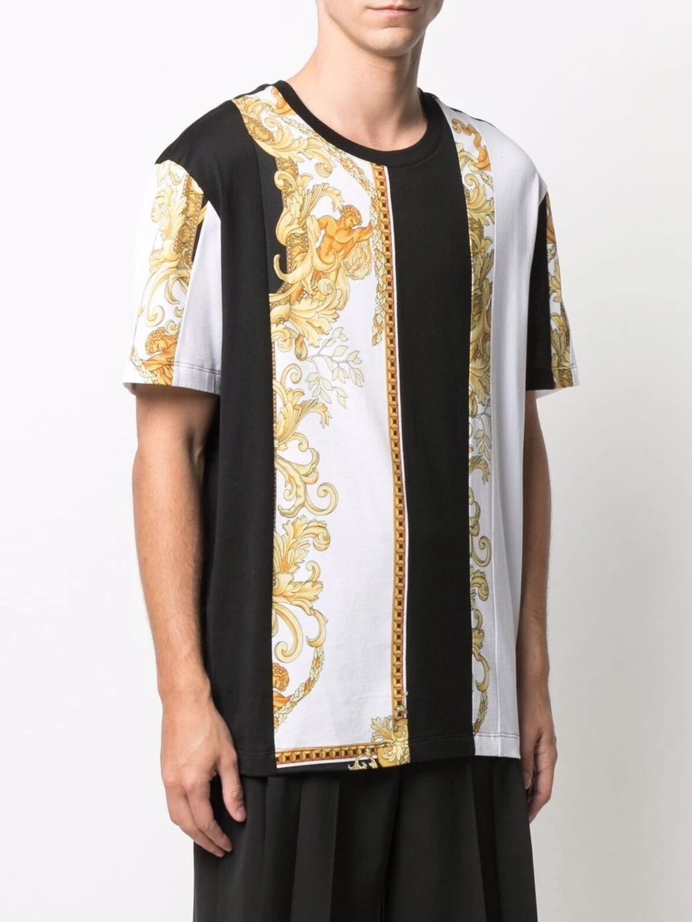 Motif baroque, rayures verticales imprimées, encolure ras du cou, manches courtes, ourlet droit. Matière : coton.