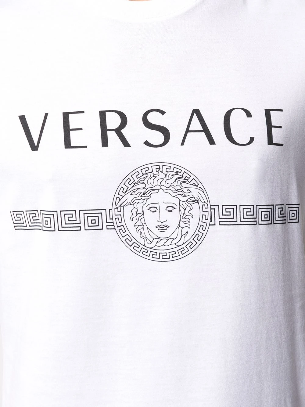 T-shirt à imprimé Medusa en coton Versace avec encolure ronde, manches courtes, imprimé devant et ourlet droit. Couleur : blanc.