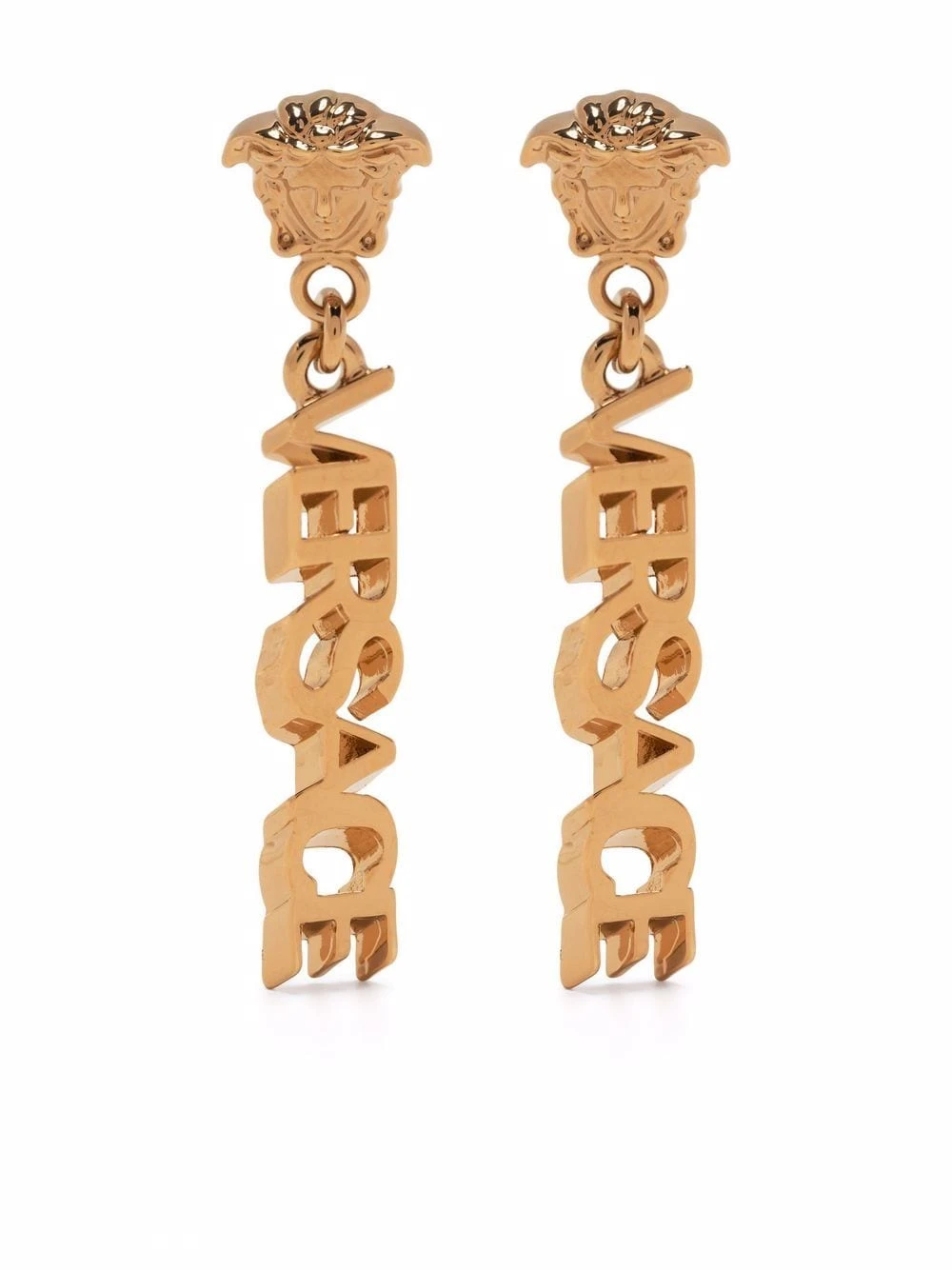 Plaque logo dorée, motif Medusa, fermoir papillon. Matière : métal. Ces boucles d’oreilles sont vendues par paire.