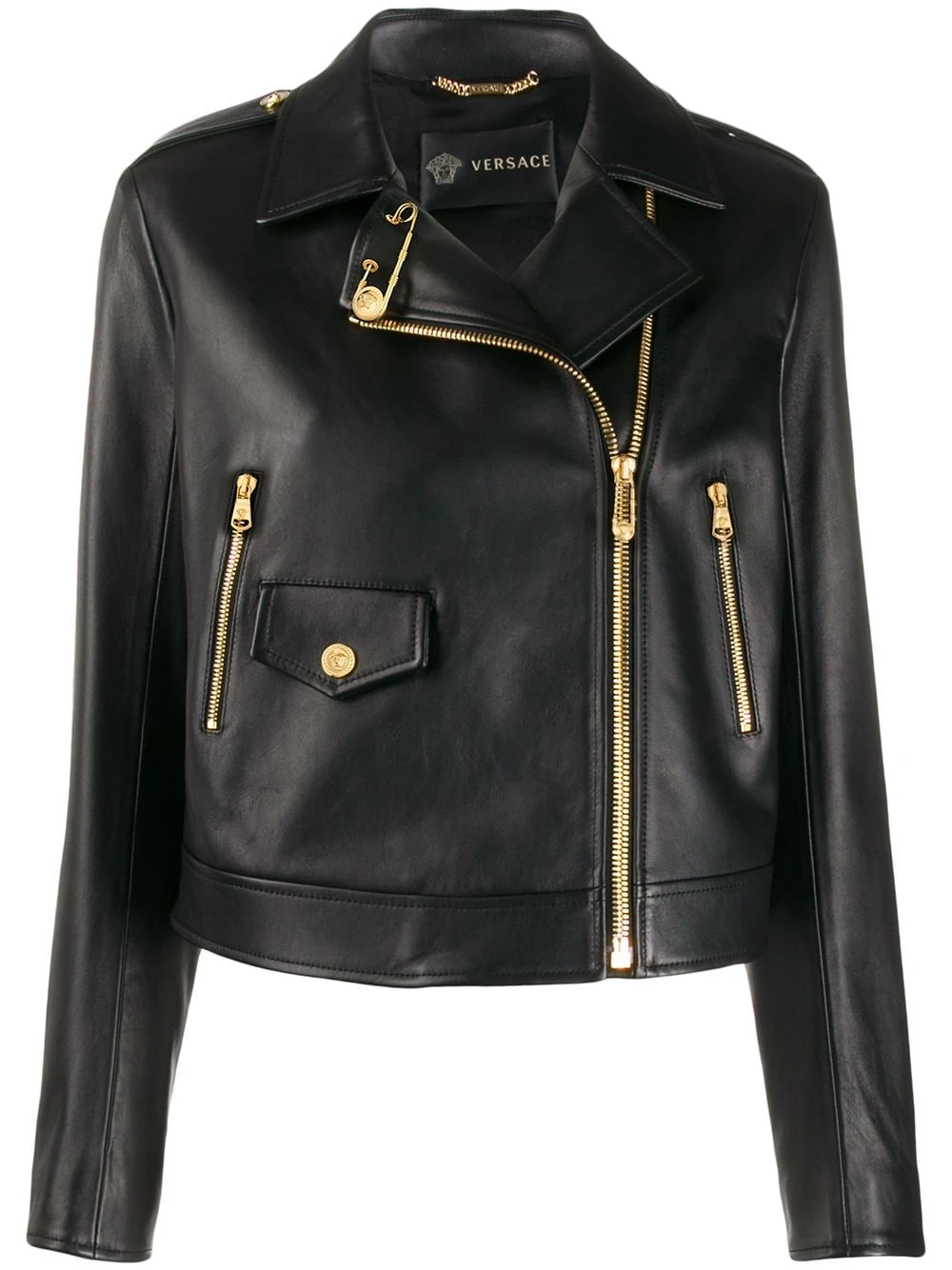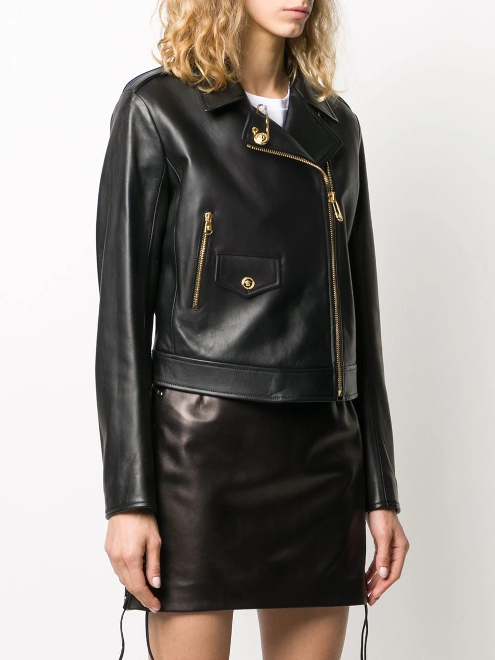Veste de moto crop en cuir d’agneau Versace avec fermeture zippĂ©e en biais, a Medusa head logo embellishment, longueur crop, manches longues, doublure monogrammĂ©e, dĂ©tails dorĂ©s, poches devant zippĂ©es et ourlet droit. Couleur : noir.